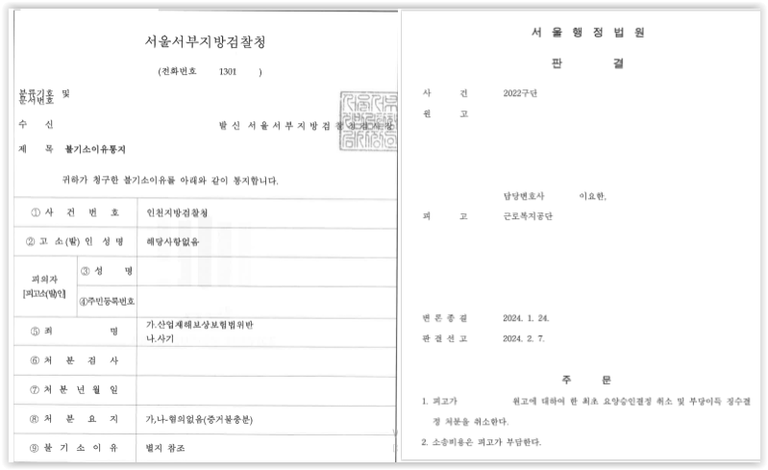 검찰에서는 위 주장을 전부 받아들여 사기 및 산업재해보상보험법 위반 혐의에 대해 무혐의 결정을 하였고, 행정법원 역시 의뢰인 전부 승소 판결을 하였습니다.