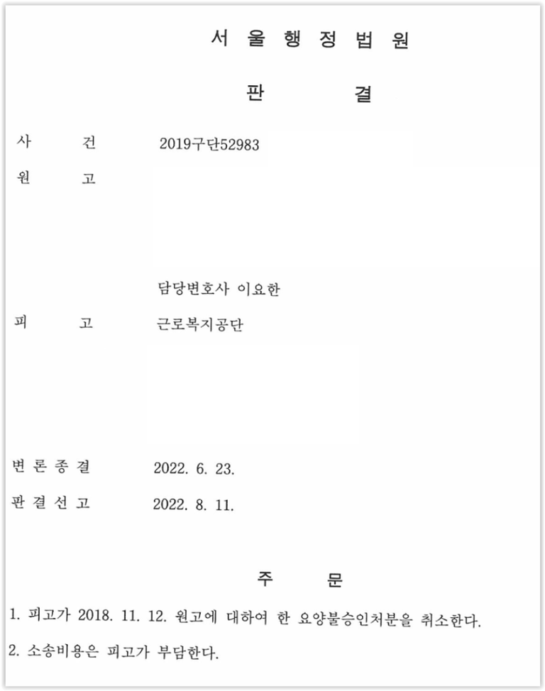 재판부는 산재전문 변호사의 주장을 받아들여, 이 사건 상병과 의뢰인의 업무 간 상당인과관계를 인정하여 공단 처분을 취소하고 승소판결을 선고하였습니다.