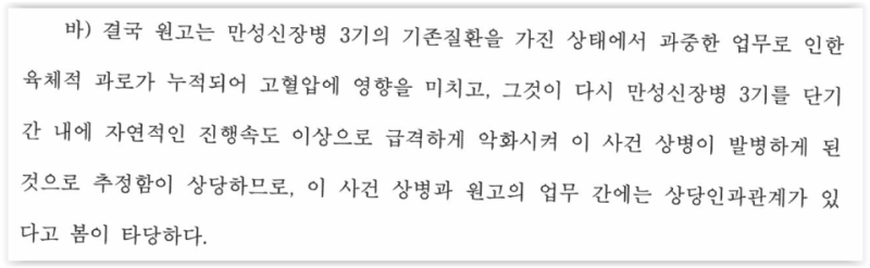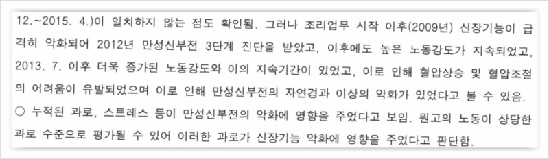 2) 만성신부전의 악화가 시간의 경과에 따른 것으로 보일 뿐, 질병을 악화시켰을 만한 만성과로가 확인되지 않는 점을 근거로 들었습니다.