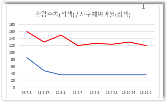 의뢰인의 의무기록을 분석하여, 혈압이 잘 관리되어 꾸준히 감소하고 있었으나 GFR은 자연적인 감소량(1년에 0.5~1)보다 훨씬 급격하게 감소하고 있는 점을 그래프로 만들어 제출하였습니다.