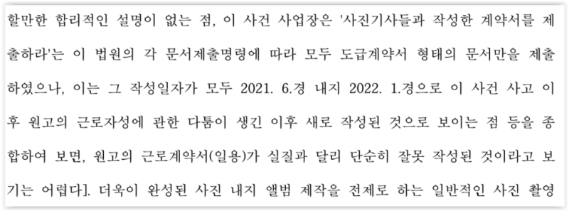 회사는 공단 조사과정에서 의뢰인 및 다른 촬영기사들과 '일용직 근로계약서'를 잘못 작성하였다고 진술하였습니다. 그러나 문서제출명령을 받고 나자 근로계약서가 아닌 용역계약서만을 제출하였고 그에 대한 합당한 설명을 하지 아니하였습니다.