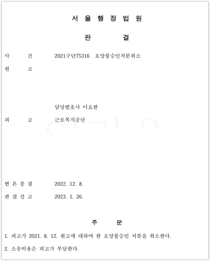 재판부는 저의 주장을 전부 받아들여 근로복지공단의 처분을 취소하는 판결을 선고하였습니다.