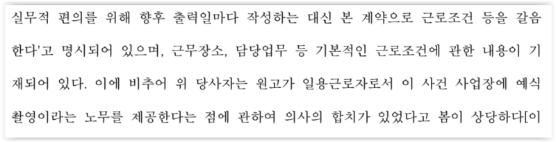 통상 근로자성이 문제가 되는 사안에서는 도급계약, 프리랜서 계약서를 작성하는 경우가 많은데, 이 사건에는 특이하게 도급계약서가 아닌 일용직 근로계약서를 작성하였습니다.