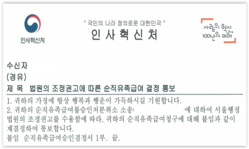 인사혁신처와 원고 역시 법원의 조정권고안을 받아들여 사건은 마무리되었습니다.
