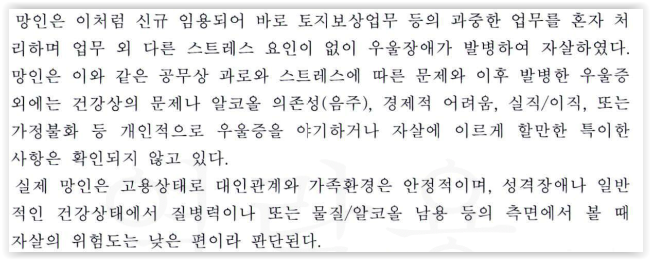 재해자는 임용 1개월만에 소속 팀장에게 업무가 힘들다는 메시지를 보낼 정도로 극심한 스트레스를 받았고, 끝내 사무실에서 졸도하여 병원으로 이송되었는데 당시 최초로 우울장애 진단을 받았습니다.