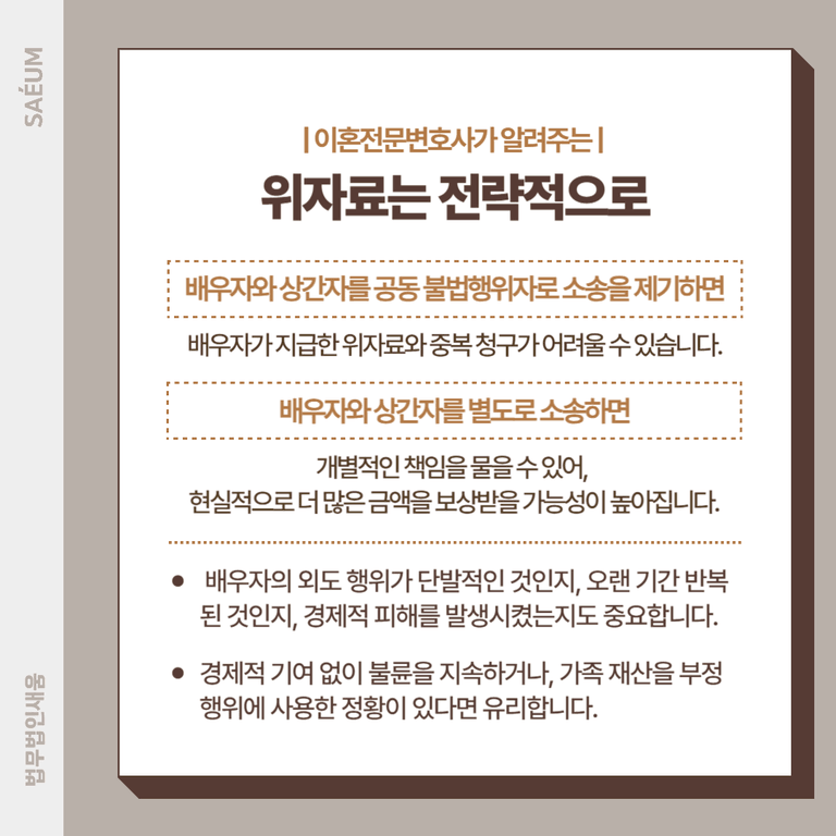 이처럼 배우자의 외도 소송은 전략적인 접근이 필요합니다. 배우자와 상간자에 대한 소송을 개별적으로 진행하고, 상대방의 책임을 철저히 입증하는 것이 위자료 극대화의 핵심입니다.