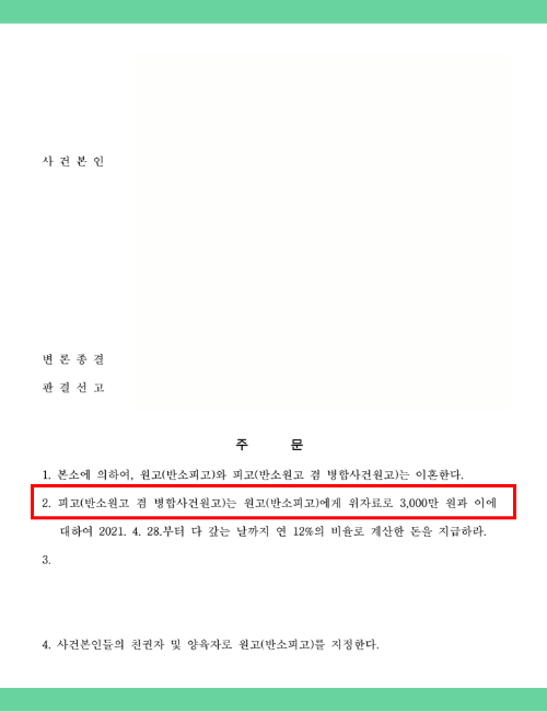 최종적으로 배우자로부터 3,000만 원의 위자료를 추가로 인정받았습니다.