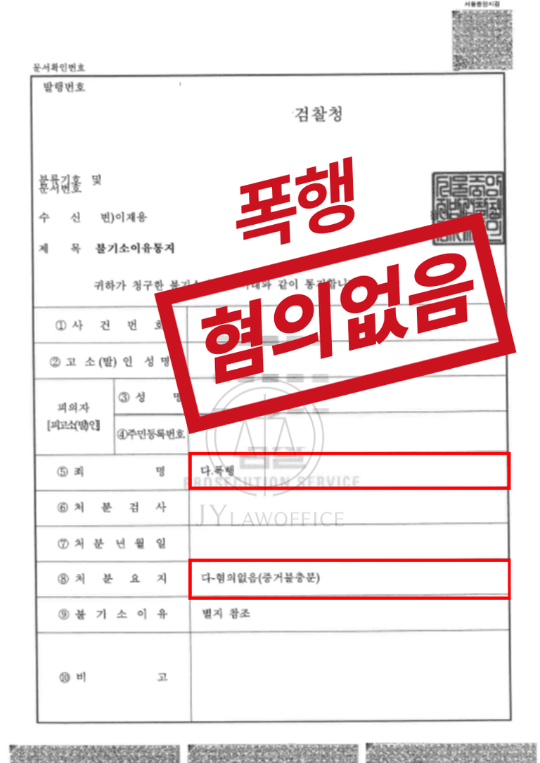 이와 같은 변호인의 노력에 따라, 의뢰인은 혐의없음(증거불충분) 처분을 받고 무사히 사건을 종결시킬 수 있었습니다.