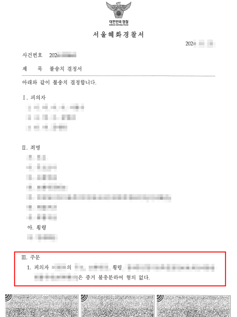 이에 경찰은 의뢰인에 대하여 무혐의 불송치 결정을 내렸습니다.