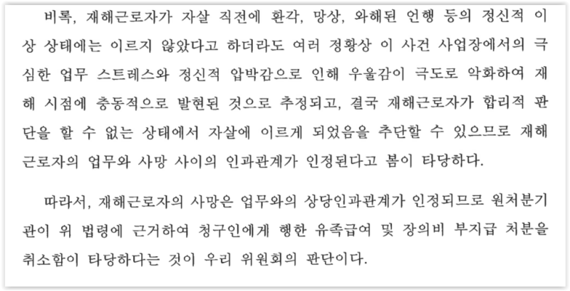 특히 재해 발생 1개월 전 합사업무가 진행예정이었는데, 계속되는 합사업무 진행이 재해자에게 부담으로 작용하였다는 점을 강조하였습니다.