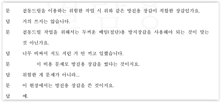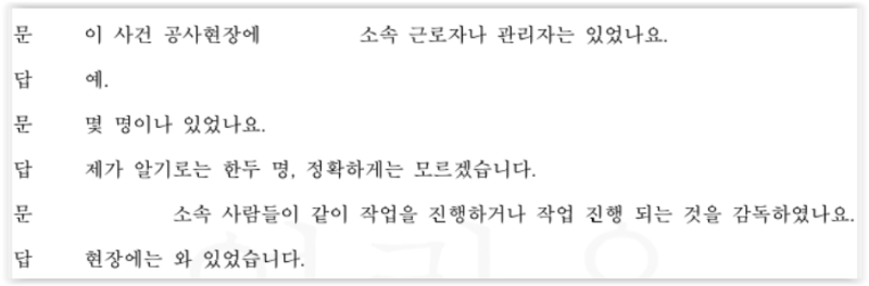 소송을 당하자 피고들은 ① B회사는 의뢰인과 근로관계가 아니며, ② 의뢰인에게 안전교육을 실시하고 보안경과 방진장갑 등 안전장구를 지급하였다고 주장하였습니다. 양자의 주장이 엇갈리자 피고 측에서 사고 당시 의뢰인과 같이 작업을 진행한 동료 작업자 C를 증인으로 신청하였습니다.