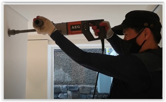 타공장소는 천장 근처에 있는 협소한 공간이었고, 의뢰인은 사다리를 타고 올라가 드릴을 양팔로 치켜 든 상태에서 작업을 해야했습니다. 당연히 자세가 불안정하여 드릴을 안정적으로 파지하기 어려웠고, 먼지가 바로 얼굴로 오는 바람에 작업에 어려움이 많았습니다.