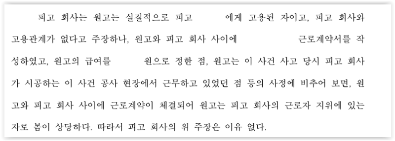 특히 재판부는 B회사와 의뢰인의 관계를 근로계약으로 보아 B에게도 A와 동일한 손해배상 책임을 인정하였고, 노동능력 상실률을 8%로 보았습니다.