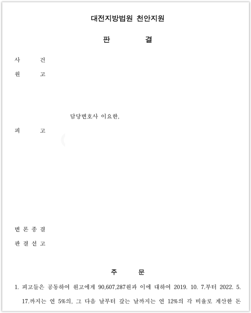 재판부는 저의 주장을 받아들여, 피고들 모두의 산재 손해배상 책임을 인정하였습니다.
