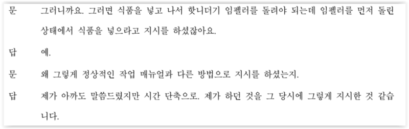 궁지에 몰린 증인은 시간 단축 때문에 핫니더기를 먼저 돌린 후 식자재를 투입하라고 의뢰인에게 지시하였고, 평소에도 이런 방법으로 작업한다고 증언하였습니다.