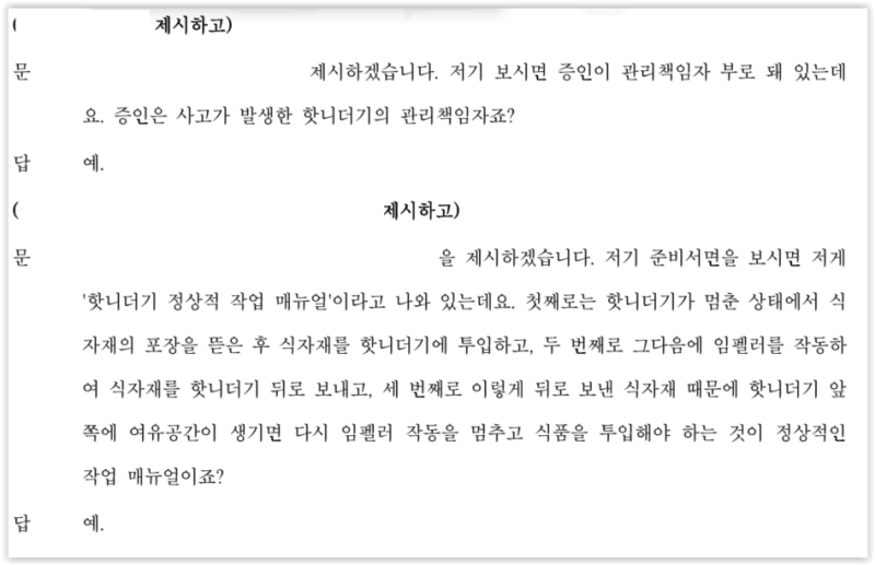 이후 사고 발생 동영상을 제시하며, 핫니더기의 관리책임자이자 정상적 작업방법을 알고 있는 증인이 작업 메뉴얼과 다르게 작업을 지시한 이유를 추궁하였습니다. 증인은 앞서 본인이 핫니더기의 관리책임자이자 정상적인 작동방법을 알고 있었다고 증언하였기 때문에, 이에 반대되는 말을 할 수 없었습니다.