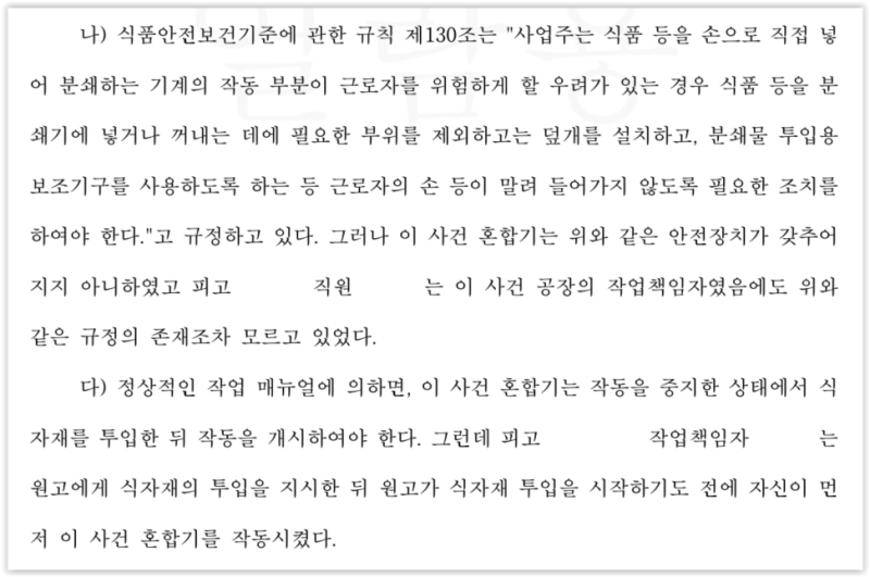 특히 피고들은 핫니더기의 작동을 정지한 상태에서 식품을 투입해야 하는데, 의뢰인이 작동중인 핫니더기에 식품을 투입하고 손을 넣다가 사고가 발생하였다고 주장하였습니다.