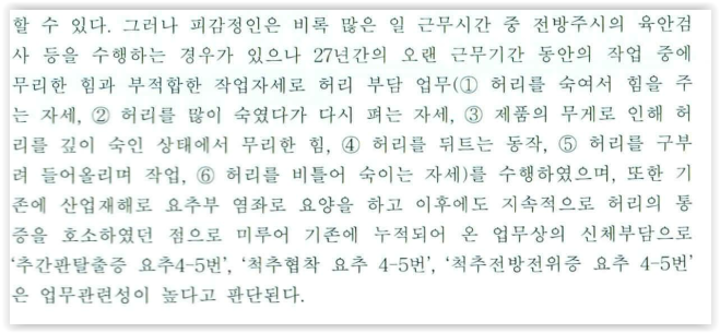 결국 원고는 2007년 공장에서 작업 중 요추부 염좌로 산재승인을 받아 요양을 한 적이 있는데, 요양종결 후에도 지속적인 허리통증을 느꼈습니다.