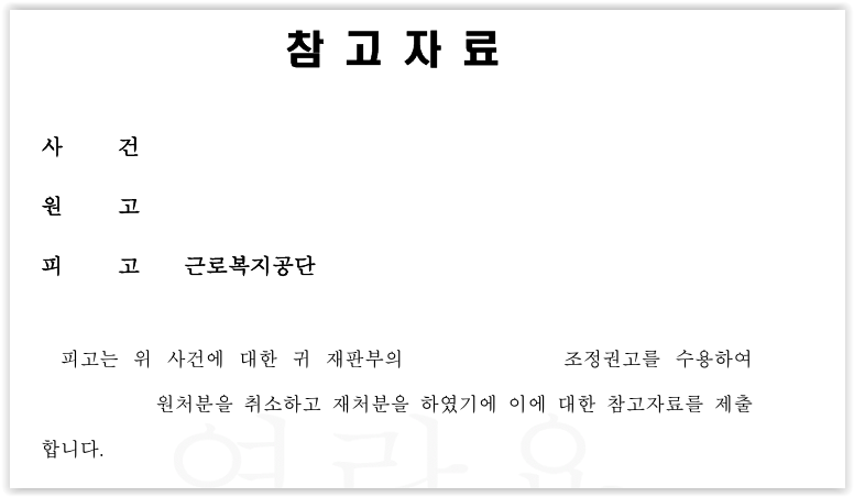 진료기록 감정서가 도착하자 법원은 근로복지공단에 요양급여 불승인처분을 취소하라는 내용의 조정권고안을 송부하였습니다. 원고와 피고는 조정권고를 받아들였고, 피고는 기존 불승인처분을 취소하고 원고의 요양급여 신청을 승인하는 재처분을 내렸습니다.