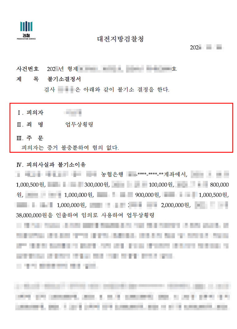 그리하여 담당 검사는 의뢰인의 약 5,600만원 업무상횡령 혐의에 대하여 무혐의 불기소 처분을 하였습니다.