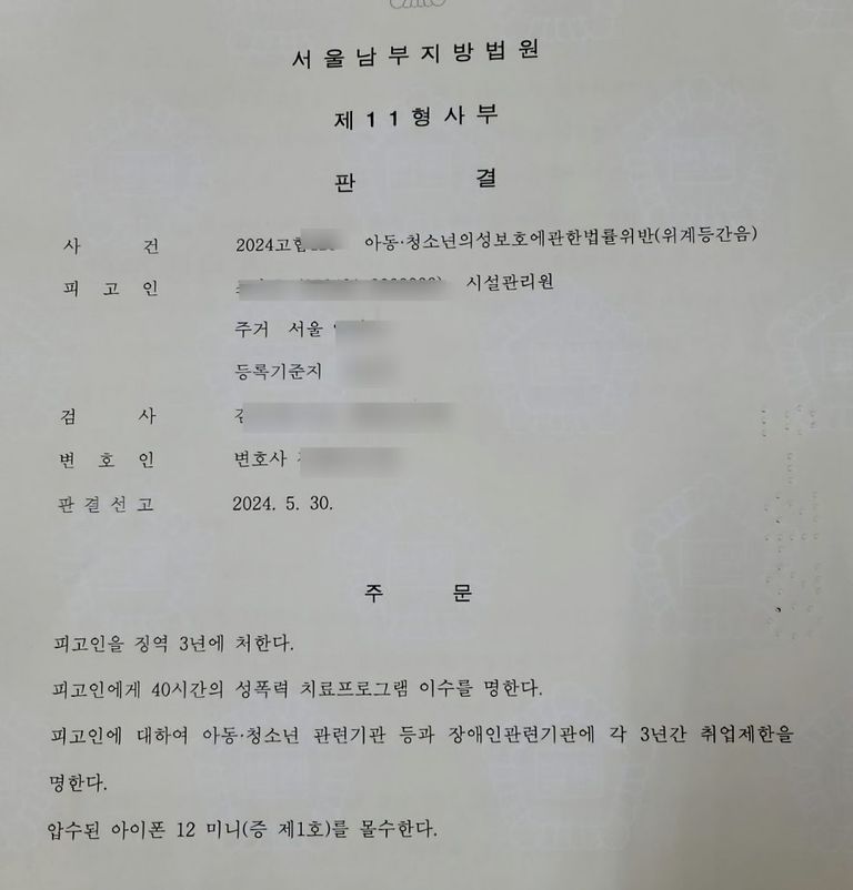 이 사건 가해자는 1심에서 징역3년, 성폭력치료프로그램 이수명령 40시간, 취업제한 3년을 선고받았고, 휴대폰이 몰수되었습니다. 그러나 2심에서는 가해자측과 피해자측은 원만하게 합의금 6천만원에 민형사상으로 이의제기하지 않기로 합의하였습니다.