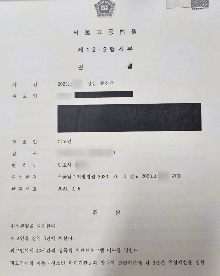 이 사건 가해자는 모두 유죄가 인정되어 1심에서 징역4년을 선고받았습니다. 그러나 항소심에서 기존 진술을 번복하여 범행을 전부 자백하였고 그 사이 1명의 피해자와는 합의하였고, 이 사건 피해자에게는 2천만원을 공탁하였습니다. 그 결과 항소심에서 1년이 감형되어 징역3년, 3년의 취업제한명령, 성폭력치료프로그램이수명령 40시간을 선고받았습니다. 이 사건 피해자는 항소심 선고 이후 국내에 입국하여 본인에게 공탁된 공탁금 2천만원을 수령하였습니다.