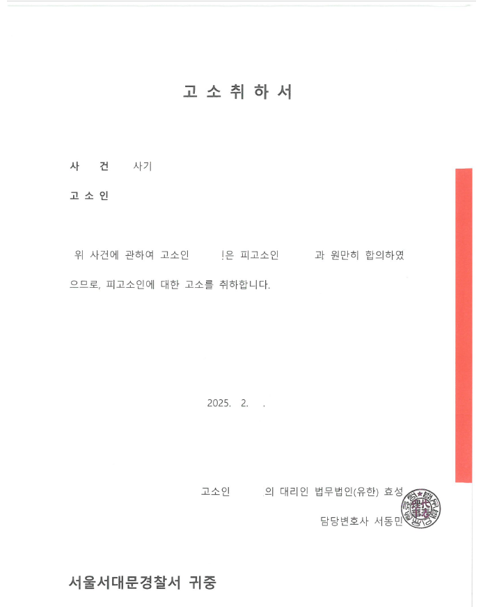 저는 즉각 지인을 상대로 민사소송 및 형사고소를 하였고 지인이 의뢰인에게 원금을 반환하기로 합의하여 저희는 고소를 취하하였습니다.