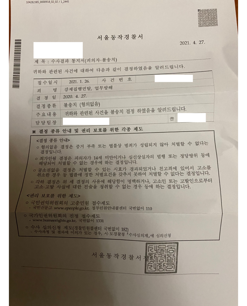 경찰에서는 저의 주장을 받아들여 혐의 전부에 대해 불송치 결정을 하였습니다.