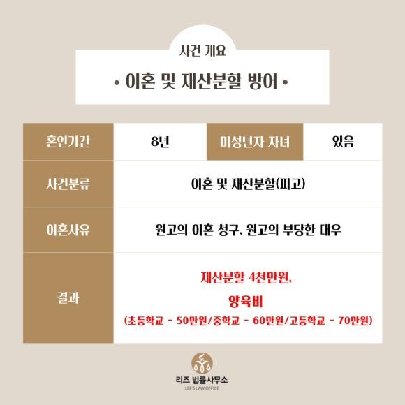 터무니없는 위자료 및 재산분할 청구에 놀란 의뢰인께서는 금액 감경을 위해 저희 리즈법률사무소를 찾아오셨습니다.