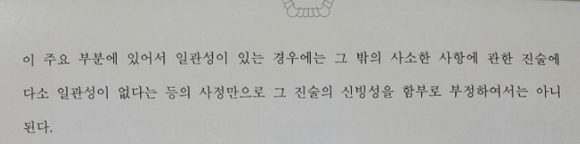 핵심적인 사실관계를 구체적이고 일관되게 진술하고 있고 그 진술이 경험칙에 비추어 비합리적이라거나 진술 자체로 모순된 점이 없다고 판시하였습니다. 또한 피해자의 지적 장애에 비추어 직접 경험하지 않은 사실을 허위로 꾸며내어 진술할 가능성은 매우 낮고 제3자로부터 암시나 유도를 받아 진술하였다고 보이지도 않는다고 하였습니다.