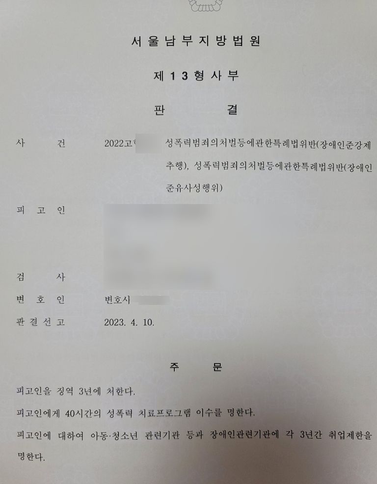 피해자 아버님과 몇 차례나 통화를 하고 몇 차례나 면담을 했는지 모르겠습니다. 선고 전까지 함께 마음을 졸였습니다. 다행히 공소사실이 전부 유죄로 인정되어 징역3년이 나왔고 가해자는 법정구속되었습니다.