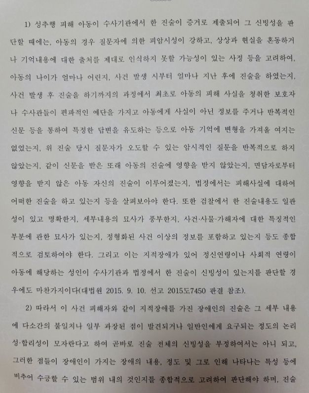 재판부에서는 성추행 피해아동의 진술의 신빙성 판단기준, 지적장애를 가진 장애인의 진술의 신빙성 판단기준에 관한 대법원 판례를 원용하였습니다.