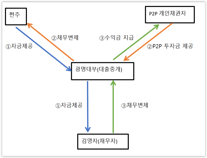 즉, 조영석은 대출금에 대해 광명대부가 P2P 투자약정(②)을 성사시키는 조건으로 대출계약 체결을 제안하였고,의뢰인은 조영석의 말을 믿고 대출에 필요한 각종 서류(연대보증 계약서, 담보제공 계약서, 법인 인감 증명서 등)를 조영석에게 주었습니다.