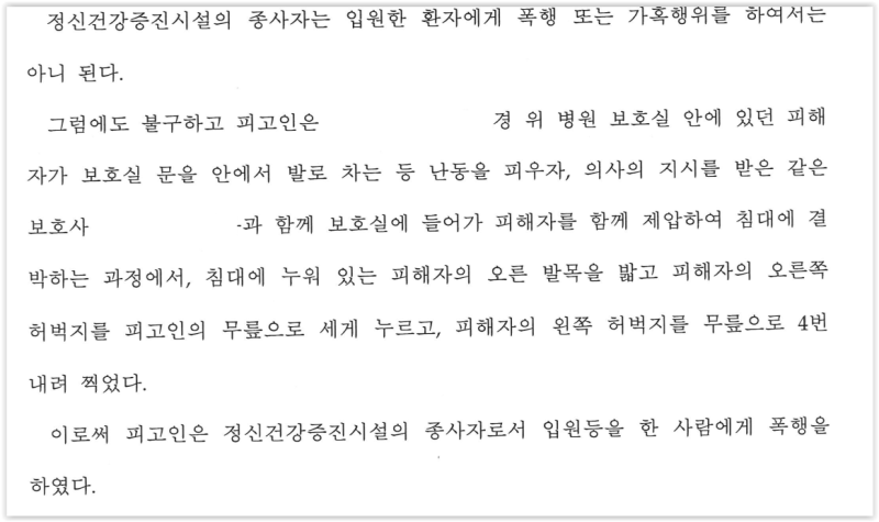 의뢰인에게 억제요법을 실시하면서 그를 폭행한 피의자를 정신건강복지법 위반으로 고소하였고, 증거보전을 통해 확보한 CCTV 영상을 증거자료로 제출했습니다.