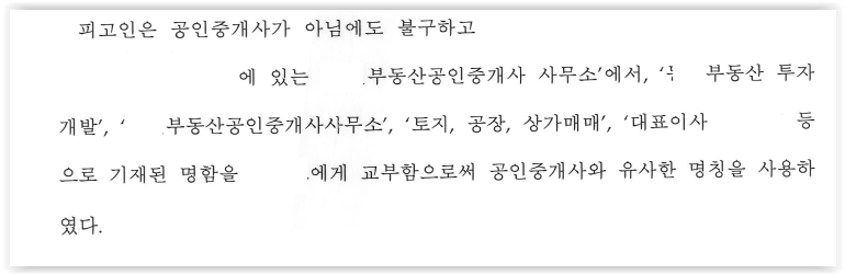 피고인은 공인중개사가 아닌데도 '공인중개사 사무소' '부동산 투자개발'과 같은 문구가 기재된 명함을 사용하였고, 사무실 외벽과 간판에도 '공인중개사 사무소'라는 문구를 사용하여 영업하고 있었습니다.