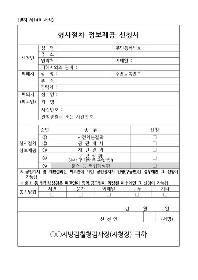 위 서식을 잘 보시면 형사절차에 대한 여러 정보 제공을 신청하도록 되어 있습니다.