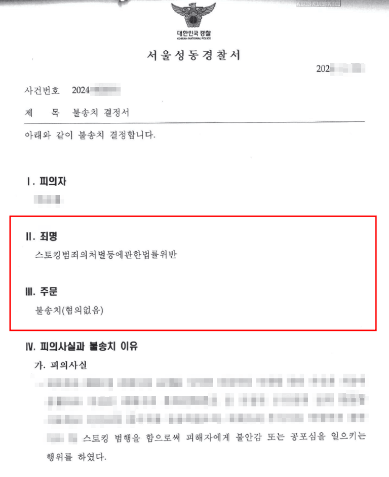 즉, 담당수사관은 ①의뢰인의 행위가 상대방의 의사에 반하지 않았고, ②적어도 의뢰인에게 스토킹에 대한 고의가 없었다고 판단한 것입니다.