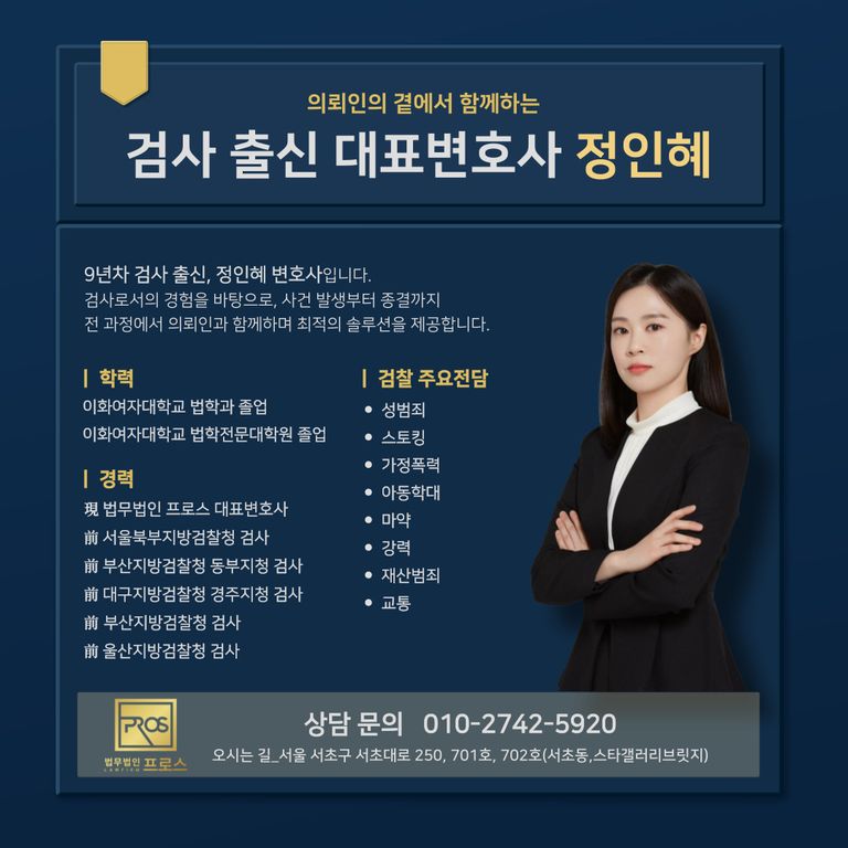 검사 출신 형사전문변호사 법무법인 프로스 정인혜 변호사입니다.