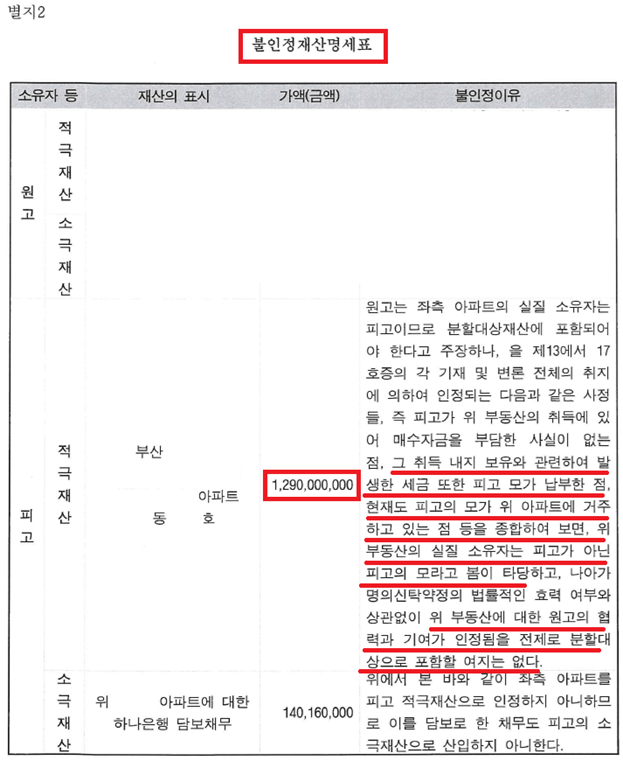 다행히도, 위 사건에서는 전문 변호사의 조력으로 인하여 부부공동재산이 아닌 재산이 이혼재산분할 대상으로 포함되는 결과를 막을 수 있었습니다만, 기본적으로 이혼 재산분할대상 재산은 공부상의 명의자를 기준으로 특정되므로, 원, 피고가 본인 명의로 보유하고 있는 금융자산과 부동산 자산을 재산분할대상에서 제외하는 것은 현실적으로 매우 어렵습니다.