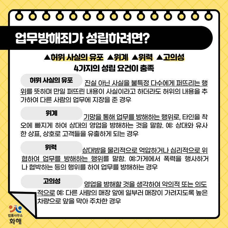 업무방해죄는 ▲허위 사실의 유포 ▲위계 ▲위력 ▲고의성 4가지의 성립 요건이 충족되어야 합니다.