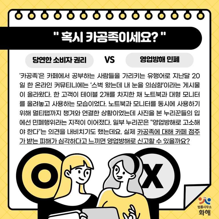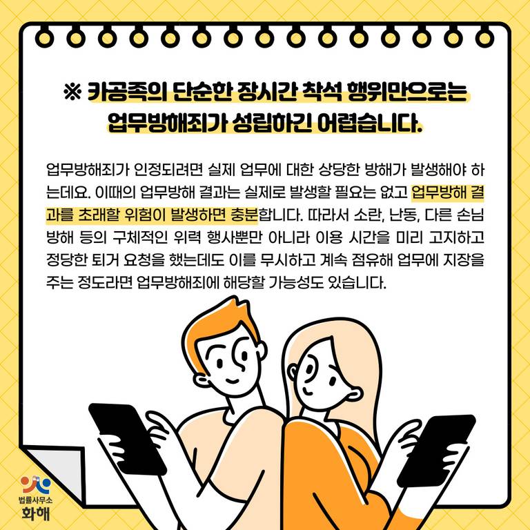 오늘은 우리가 생각하는 것보다 훨~씬 넓은 업무방해죄의 범위와 성립 요건에 대해 알려드리면서 온라인상에서 화제가 되었던 [카공족(카페에서 공부하는 사람들)이 영업방해 민폐일까? vs 당연한 소비자 권리일까?] 논란에 대해서도 살펴볼게요.