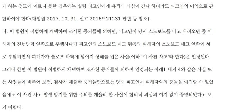 ○ 문제는 간접 증거로도 피의사실은 인정될 수 있다는 것인데, 상대방 스키어, 즉 고소인 측은 사고 당시가 아닌 사고 이전에 당사자들이 있었던 지점을 보여주는 사진과, 목격자의 간접 진술, 그리고 피의자가 사고 발생에 대하여 사과하고 합의를 제안했던 메시지 등을 근거로 삼아 매우 강경하게 처벌을 요구하였습니다. 고소장을 접수하고 고소인진술을 들은 수사관 또한 ‘잘못한 게 없다면 왜 사과하고 합의금을 주겠다고 하겠느냐’면서 송치 쪽으로 이미 완전히 기울어진 상태였습니다.