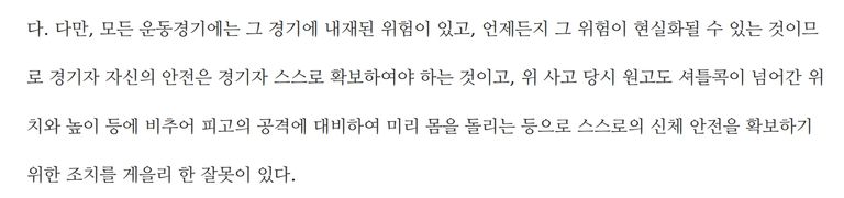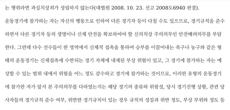 ○ 위 내용 중 1), 2)는 이해하기가 쉽지만 3)은 무슨 소리인가 하실 수 있는데요. ‘허용된 위험의 원칙’이란 익스트림 스포츠뿐만 아니라 일반 스포츠, 그 외 원래부터 위험을 수반하는 사회의 다양한 활동에 적용되는 법리로서, ‘어떤 활동들은 원래부터 위험하기 때문에, 그 활동을 하는 사람들은 부상의 가능성을 인지하고 활동을 하게 된다.’는 것입니다. 허용된 위험의 원칙에 따라 형사적으로는 과실치상을 인정하기가 어려워지고, 민사상으로는 손해배상책임이 없어지거나 줄어듭니다. 실제로 판례들을 보더라도 민형사적으로 이 ‘허용된 위험의 원칙’을 설시한 것들이 많이 있습니다.