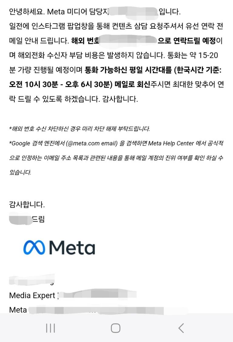 위와 같은 이메일을 받은 후 정확히 3일 뒤에 제가 말씀드린 시간에 전화가 왔습니다. 제가 이런 과정을 설명드리는 이유는... 확실한 정보임을 확인시켜드리기 위해서..? 아무튼 이제 본격적으로 메타 직원님과 통화한 내용을 정리해서 말씀드리겠습니다.