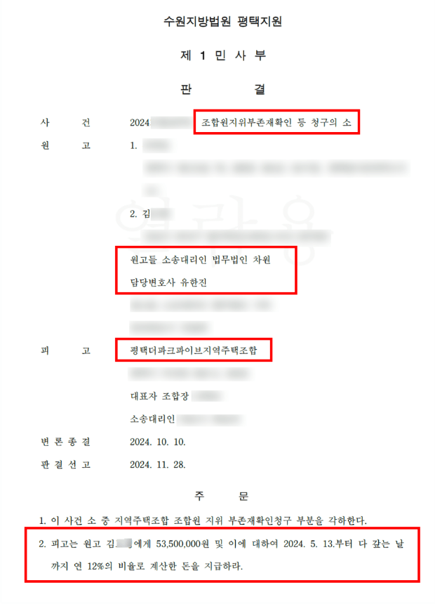 이에 수원지방법원 평택지원에서는 이러한 최동욱 변호사의 소명을 받아들여 의뢰인의 조합원 자격이 상실되었음을 판시하며 평택더파크파이브 지역주택조합으로 하여금 의뢰인에게 5,350만원의 분담금을 반환하라는 승소판결을 선고하였습니다.