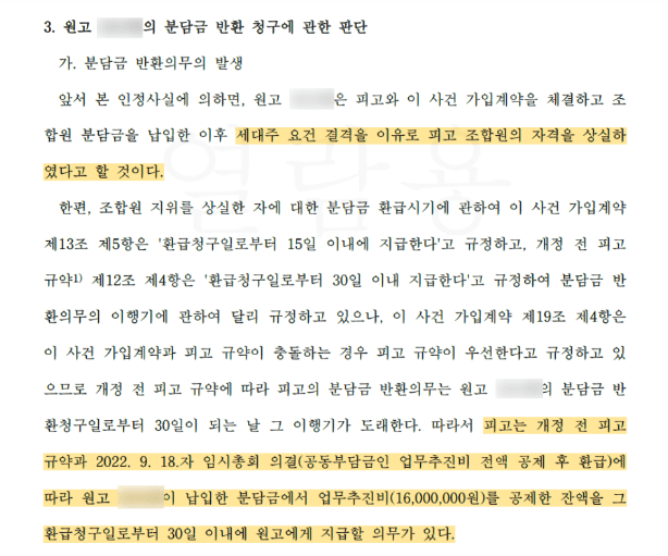 참고로 해당 조합은 지위를 상실한 조합원에게 지불해야하는 분담금 반환의 범위를 조합에 좀 더 유리하게 개정한 새로운 규약이 있는 상태였습니다. 이에 최동욱 변호사는 의뢰인이 세대주 자격을 잃어 주택법 시행령 제21조에 따라 더이상 조합원지위가 인정되지 않는다고 소명함과 동시에 해당 의뢰인은 규약 개정 전에 조합원 지위를 상실하였기 때문에 반환금 또한 개정 규약 효력발생일(2024. 1. 21.) 이전의 규약에 따라 5,350만원이어야 함을 입증·주장하였습니다.