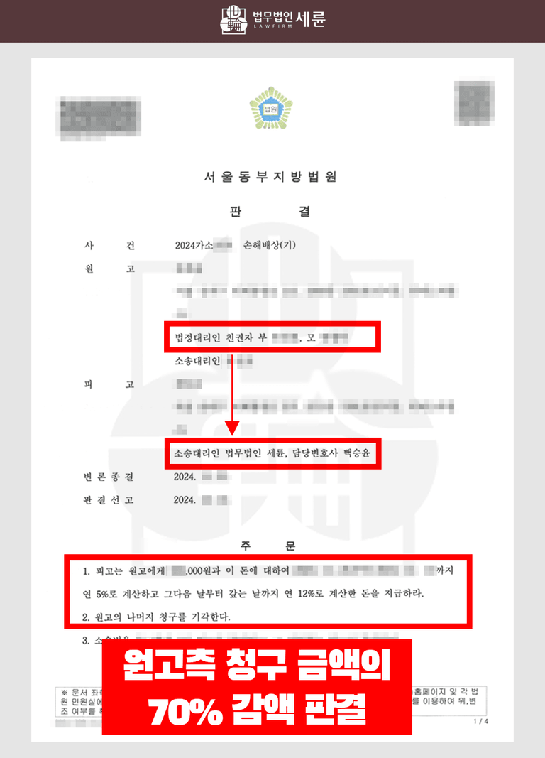 이러한 주장과 근거자료를 통해 원고가 주장하는 것(P군의 부모가 자녀에 대한 보호 감독의무를 게을리 했다거나, 상당인과관계 있는 손해배상액이라는 점)이 부당하다는 점을 밝혔고, 결국 법무법인 세륜의 조력으로, 원고가 청구한 피해보상 위자료 금액의 70% 이상을 감액하는데 성공하였습니다.