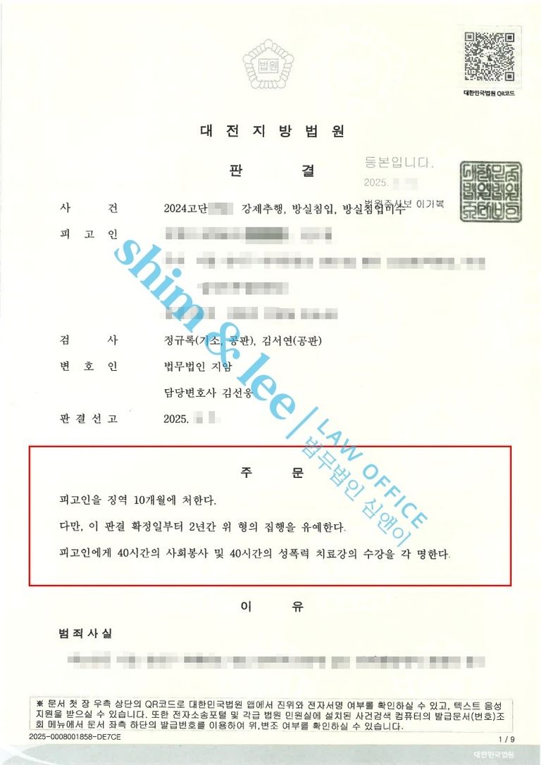 결국 자신의 범행을 일관되게 부인하던 가해자에 대해 강제추행, 주거침입 및 강제추행, 방실침입미수의 죄명이 모두 인정되어 징역 10월, 집행유예 2년이 선고되었고, 성폭력 치료강의 40시간, 사회봉사 40시간이라는 부가 처분까지 내려졌습니다.