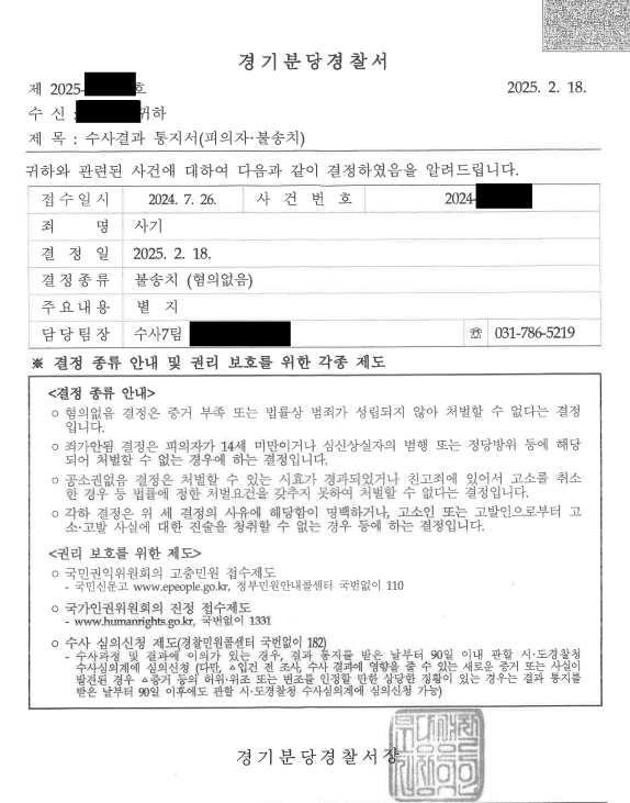 다행히도 의뢰인의 걱정과 다르게 혐의없음 처분을 받게 되었습니다. 의뢰인은 혐의없음 처분에 만족하였고, 법률사무소 무율에 감사한 마음을 전달해 주었습니다.
