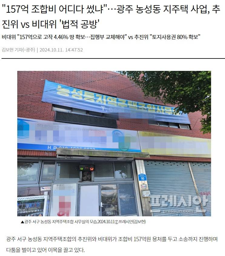 * 출처: 김보현 기자, "157억 조합비 어디다 썼냐"…광주 농성동 지주택 사업, 추진위 vs 비대위 '법적 공방', 프레시안, 2024.10.11., 링크: https://www.pressian.com/pages/articles/2024101114002784418)